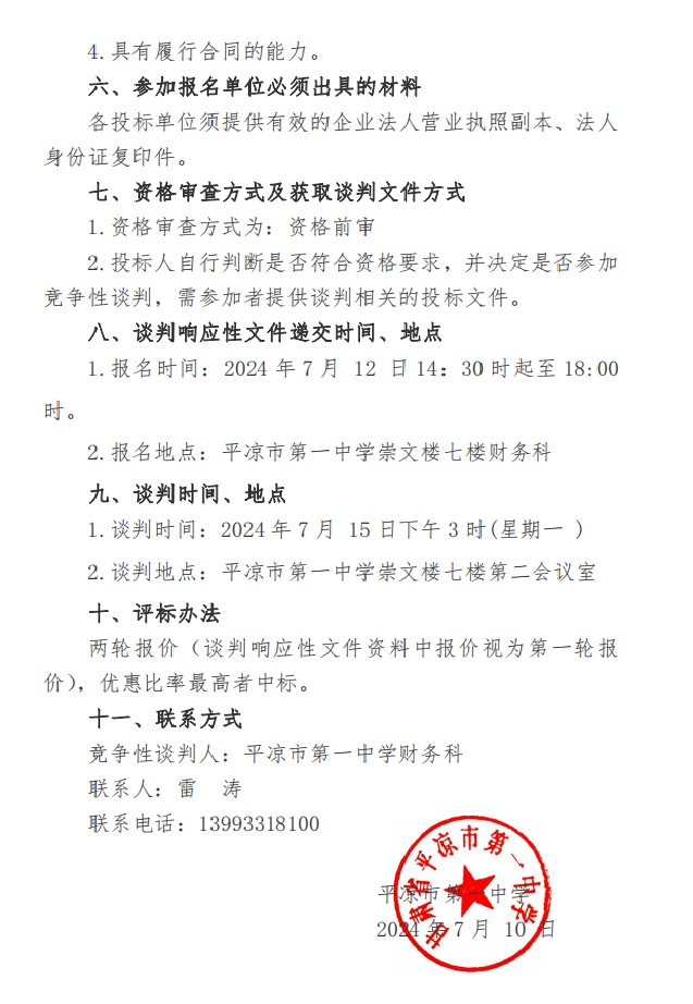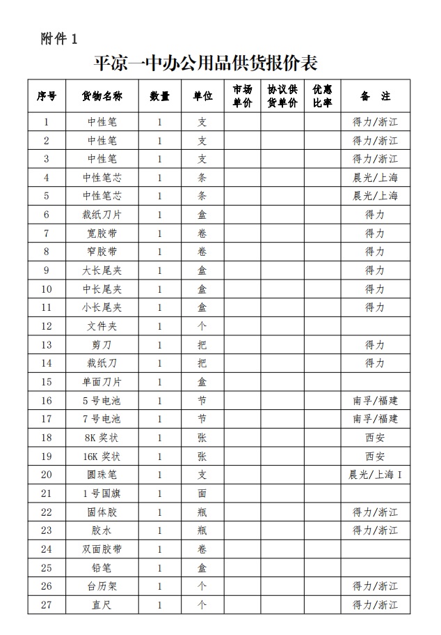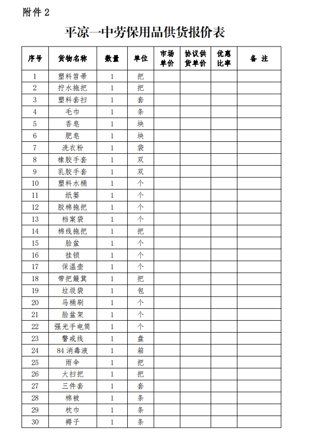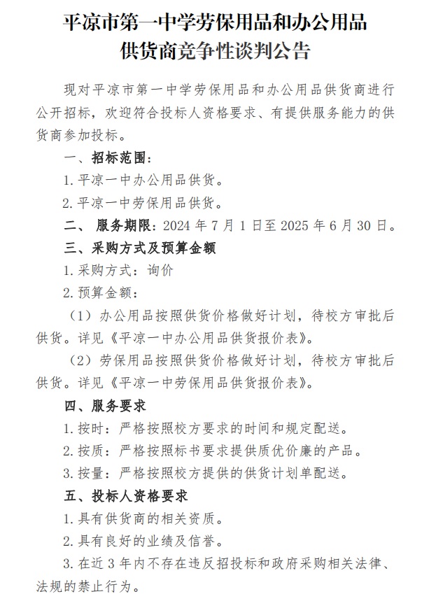 平凉市第一中学劳保用品和办公用品供货商竞争性谈判公告